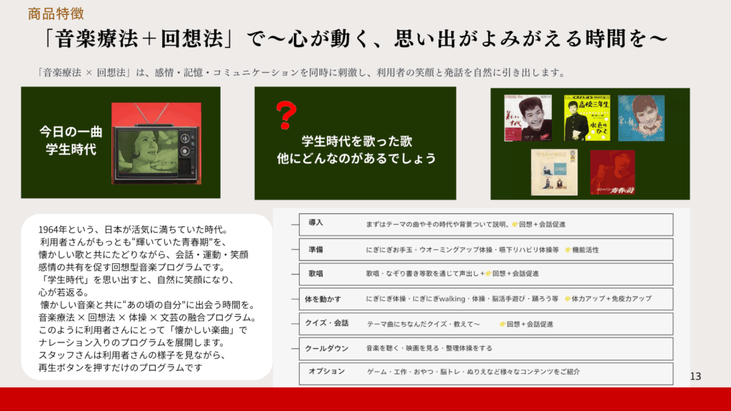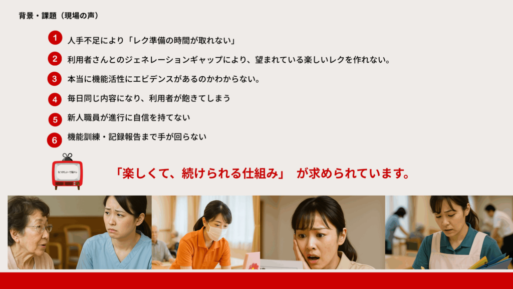 私たちは、だれでも安心して進行できる「懐かしレク教材」と、支える人を育てる養成講座を通じて、