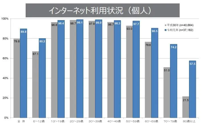 シニア世代のネット利用状況高齢者のインターネット普及率高齢者(60歳〜69歳)の利用率は90.5% となっています。 また、 50~59歳を見ると97.7% と、ほとんどの方がインターネットを利用していることがわかります。今後シニアはより人口が増加し、消費者として決して無視できない層となっています。とりわけ高齢者をターゲットにするサービスなどを展開しているなら、動画の活用は不可欠となります。