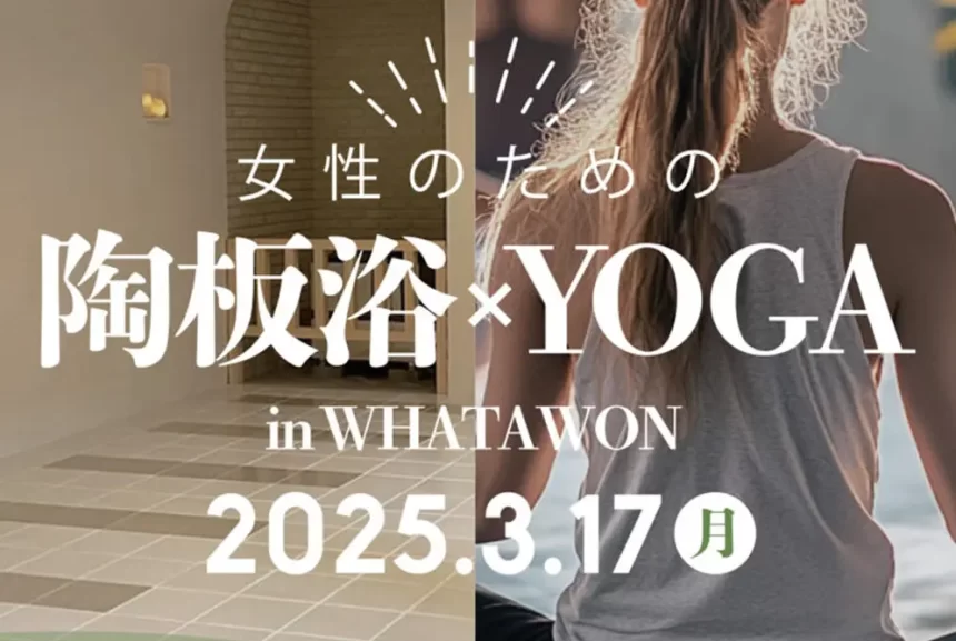 2025年3月17日(月)に南大阪の商業施設WHATAWON(ワタワン)京町湯屋SOKOTOTOにて、「女性のための陶板浴×YOGA」を開催いたします。遠赤外線効果と特殊酵素で作られた抗酸化陶板浴で身体を温めながら、ヨガの呼吸法とポーズで心と身体を整える60分間。デトックス・美肌・リラクゼーションを一度に体験できるイベントです。