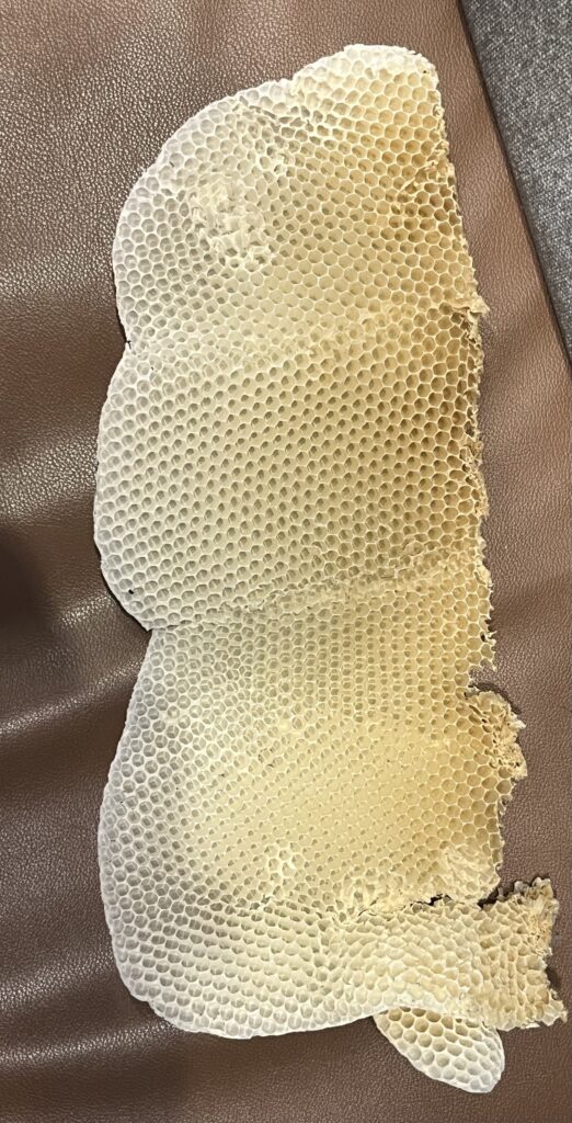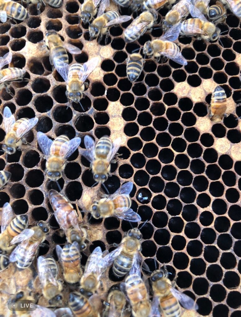 上の薄い黄色のところは蜂蜜が溜まって蜜ブタが出来ています。蓋が出来ることで中の蜂蜜の糖度が上がります。