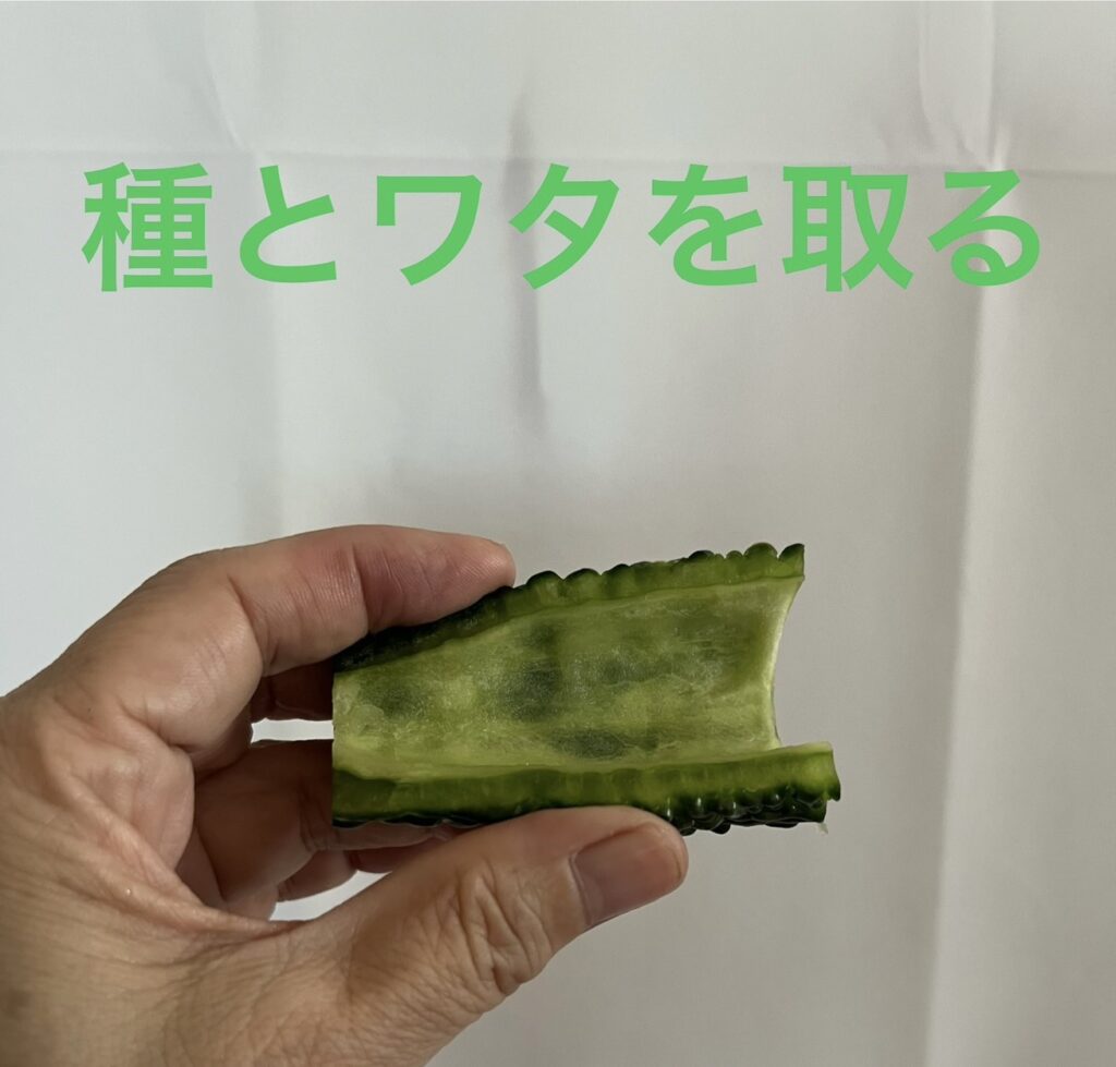 ゴーヤの苦みは多くがワタと種にあるため、スプーンできれいに取り除きます。