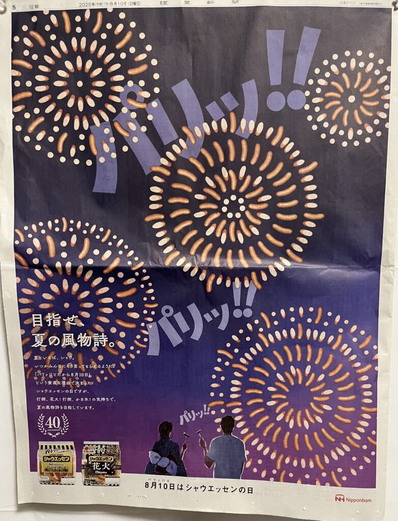 というのも今朝の新聞一面広告に8月10日はシャウエッセンの日という文と共にシャウエッセンで出来た⁈花火が🎇