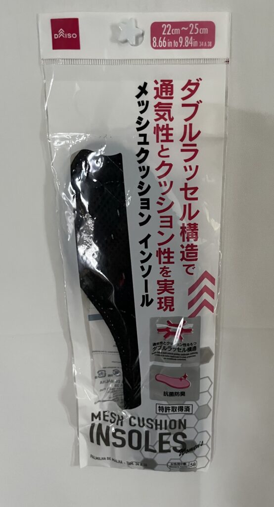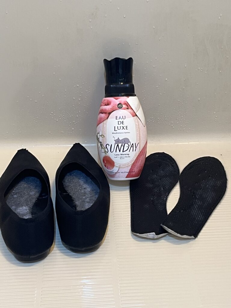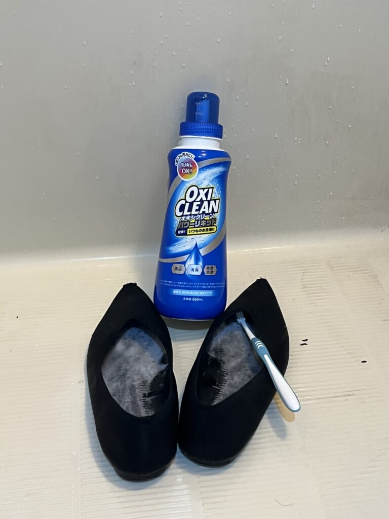 パンプス&最初に付いてた中敷きの代わりに購入したDAISOの「ダブルラッセル構造で通気性とクッション性を実現!」というなんとも頼もしいキャッチフレーズの「メッシュクッションインソール」にオキシクリーンをドバドバ・・・・・。
