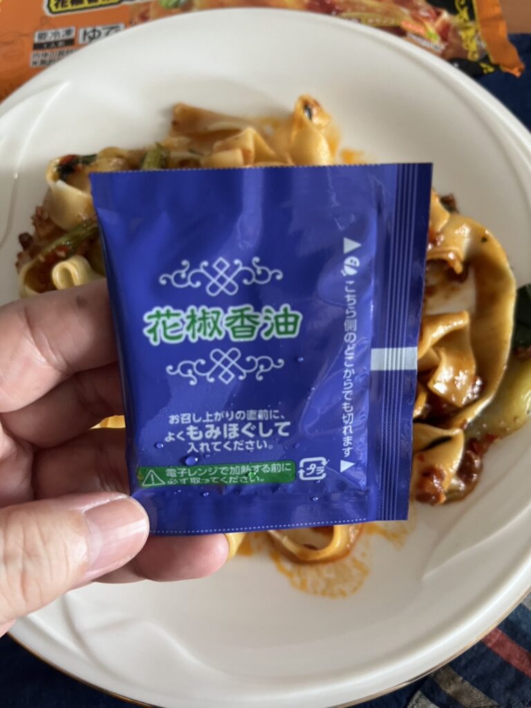 600Wで6分チンするのみ。 かなり巾広の麺にコク旨だれ😉ピリカラと酸味だ~~ プラス花椒香油をかけると、ケホッっとなるくらいでした。 ごちそうさまでした。