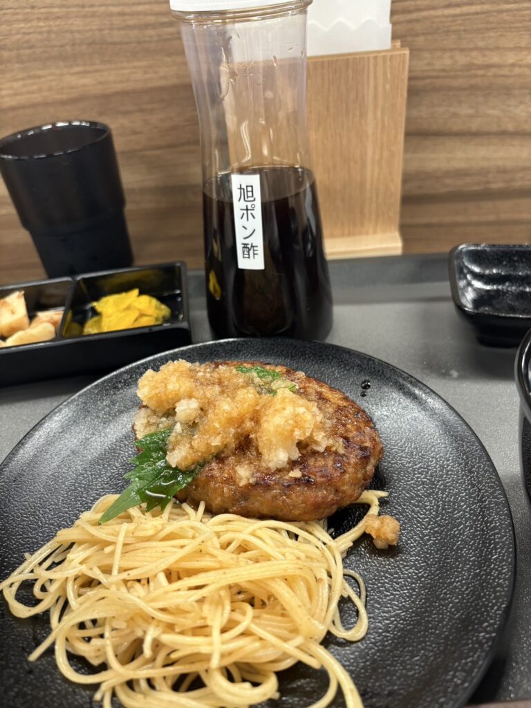今回選んだのは「おろしハンバーグ定食」¥900 (ハンバーグ&大根おろし&ご飯&タケノコ土佐煮&ご飯&つぼ漬け&お味噌汁)
