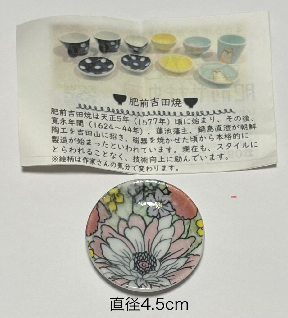 少し大きめのカプセルに唐津焼・伊万里鍋島焼・武雄焼・肥前吉田焼・有田焼・三川内焼・波佐見焼のいずれかの豆皿やカップ等が入っています。