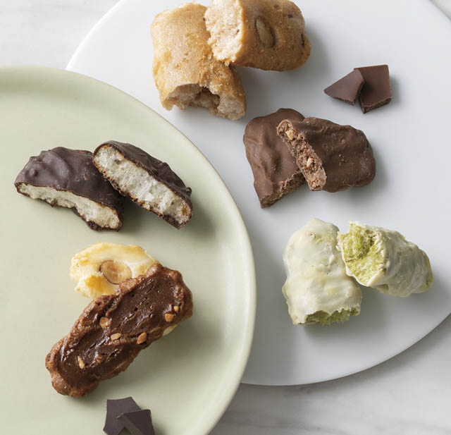 まろやかなミルクチョコレートの甘みが引き立つ「ミルクチョコレートあられ」、深みのあるダークチョコレートが香ばしい醤油コーティングを引き立てる「ダークチョコレートせんべい」、抹茶とホワイトチョコレートのマリアージュが溶け合う「抹茶あられ」、そしてアーモンドや醤油の香ばしさを生かした「ココアあられ」――。そこに、黒豆や黒糖などの香り豊かな粒も加わり、心ほどけるティータイムを演出します。