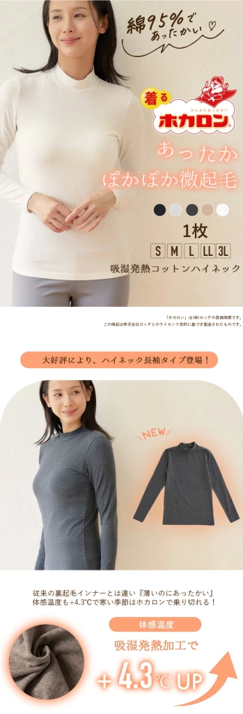 | 着るホカロン あったかインナー ハイネック レディース 長袖 綿混 綿 インナー S M L LL 3L 綿95% コットン 綿 インナーシャツ 肌着 下着 暖かい 吸湿発熱 冬 保温 あったか インナー 黒 防寒 トップス 両面微起毛 価格:2,200円(税込、送料無料) (2025/11/28時点) 楽天で購入 |
