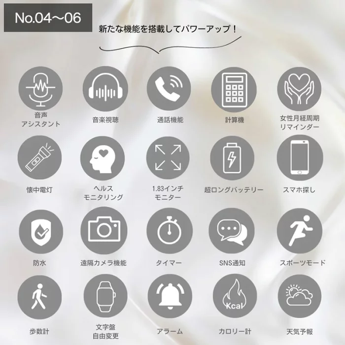 - 医療・安全機能: 医療機器認証の血圧測定機能や、GPS、転倒検知機能も重要。