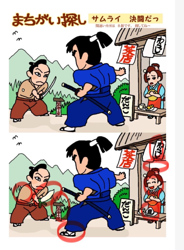 間違い探し サムライ 決闘だ! 間違え探し ①わらじ ねらじ ②刀 大根 ③だんご おにぎり ④娘の顔 怖い 笑う ⑤江戸参十里 江戸参千里 ⑥武士わらじ 武士左足 ⑦左の人の着物の紋 ⑧女性の後ろの窓の大きさ 介護施設向けレクの【問題点と解決法】懐かしい時間でたのしむレク時間 懐かしい時間 まつの木小唄とお座敷小唄 関連記事 otonanavi 脳トレ 間違え探し 漢字 otonanavi 間違い探し 忍者と浪人の戦い otonanavi 間違い探し 足柄山の金太郎 otonanavi 間違い探し 桃太郎の鬼退治 otonanavi 間違い探し otonanavi 間違い探し 泥棒を見て縄を綯う
