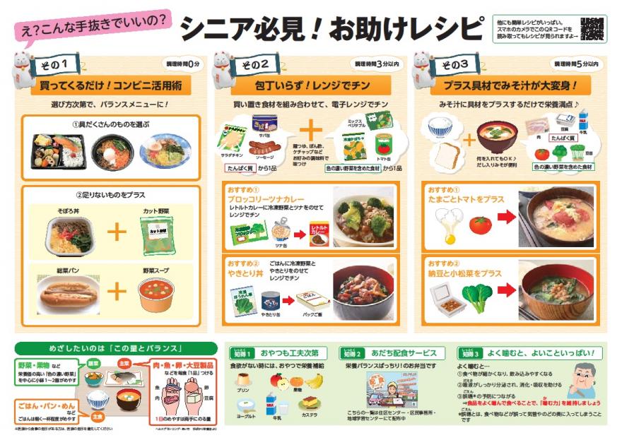 フレイル予防の食事リーフレット「65歳からはやせてきたら要注意!?」には、「こんな手抜きでいいの?シニア必見!お助けレシピ」を載せています。