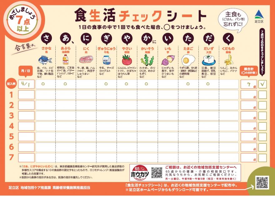 食品をまんべんなく食べると10点満点となります。7点以上をめざして、まず1週間チェックしてみまませんか。