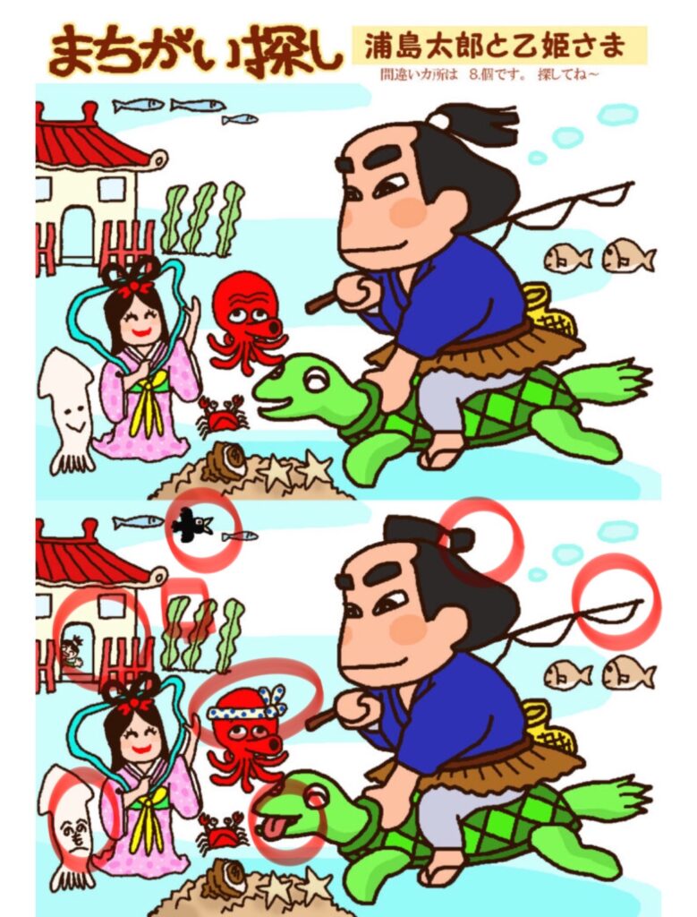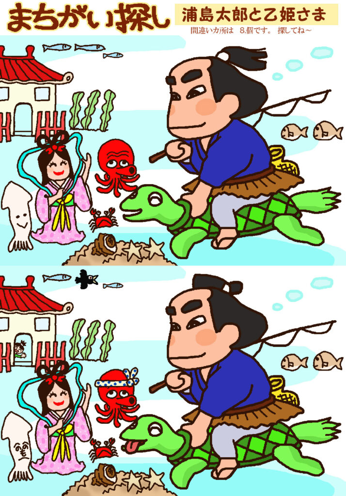 間違い探し 浦島太郎と乙姫様 間違え探し ① 左端のワカメの長さ② カラスが飛んでいる③ 竜宮城から女の子が覗いている④ 亀があっかんべー⑤ タコのハチマキ⑥ イカの顔⑦ 浦島太郎の髷⑧ 釣り糸の右端のたるみの違い 懐かしい時間 霧島昇さん「誰か故郷を想わざる」で音楽回想法 間違い探し 東海道の案山子 関連記事 otonanavi 間違い探し お奉行 一件落着 otonanavi 間違え探し 猫 otonanavi 間違い探し だるまさん otonanavi 間違い探し 見ざる言わざる聞かざる otonanavi 一つだけ違う文字はどれ? otonanavi 間違い探し 忍者と浪人の戦い