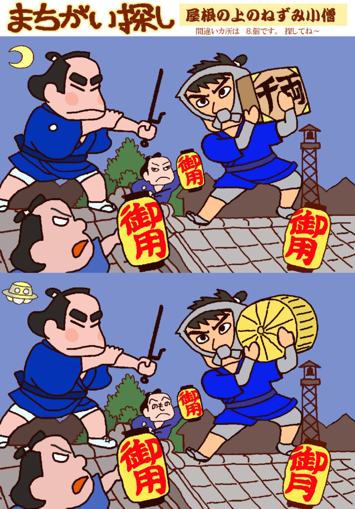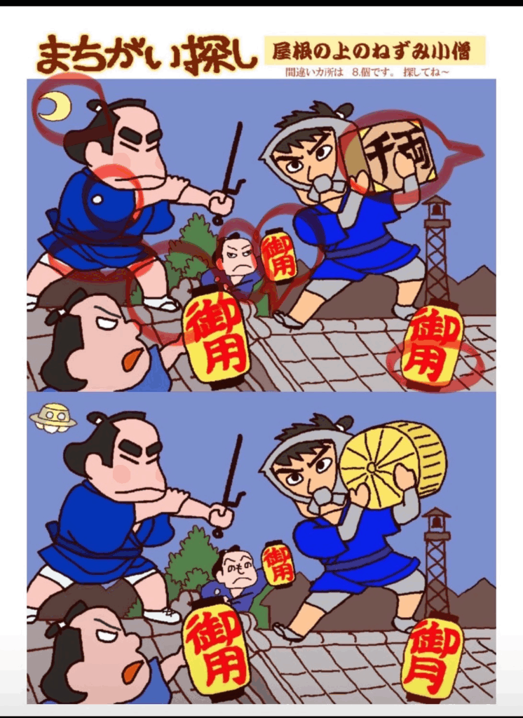 間違い探し 屋根の上の鼠小僧 間違え探し ① 御用の用が月に② 千両箱が俵に③ 月がUFOに④ 着物の紋が消えている⑤ 着物の皺のより方が違う⑥ 履き物が草履から靴になっている⑦ 顔がへのへのもへじに⑧ 真ん中の御用提灯の大きさが違う 間違い探し 桃太郎の鬼退治 間違い探し 江戸の町に追いはぎ 関連記事 otonanavi 間違い探し 一つだけ違う絵を探してください! otonanavi 間違い探し 泥棒を見て縄を綯う otonanavi 脳トレ・間違え探し otonanavi 一つだけ違う文字はどれ? otonanavi 間違え探し脳トレ otonanavi 同じハンバーガーを探してください