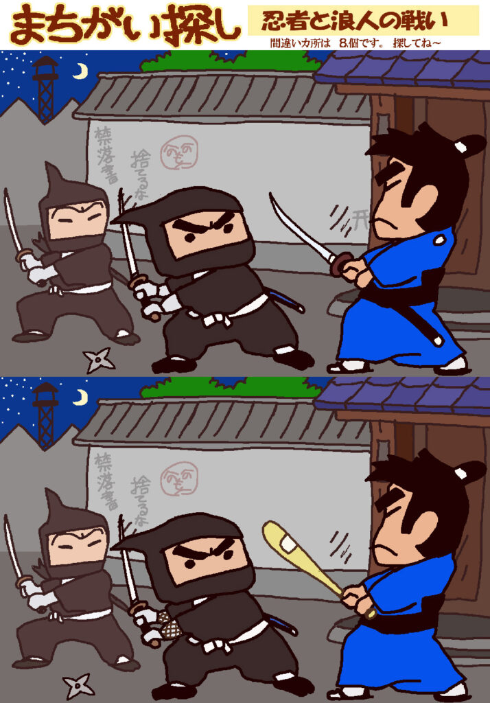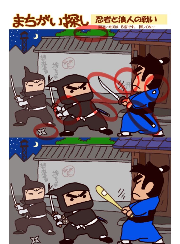 間違い探し 忍者と浪人の戦い 間違え探し ① 手裏剣の落ちてる位置② 木と木の間の星③ 塀の右下の落書き④ 浪人の刀がバットに⑤ 真ん中の忍者の衣装の手首の柄⑥ 真ん中の忍者の腰の鞘の長さ⑦ 浪人の鞘が無くなっている⑧ 浪人の着物の紋 間違い探し 美術の秋 間違い探し 足柄山の金太郎 関連記事 otonanavi 間違い探し 江戸の魚屋さん otonanavi 間違い探し 棚からぼたもち otonanavi 間違い探し 無宿ものに囲まれた用心棒 otonanavi 脳トレ 間違え探し otonanavi 同じハンバーガーを探してください otonanavi 間違え探し脳トレ