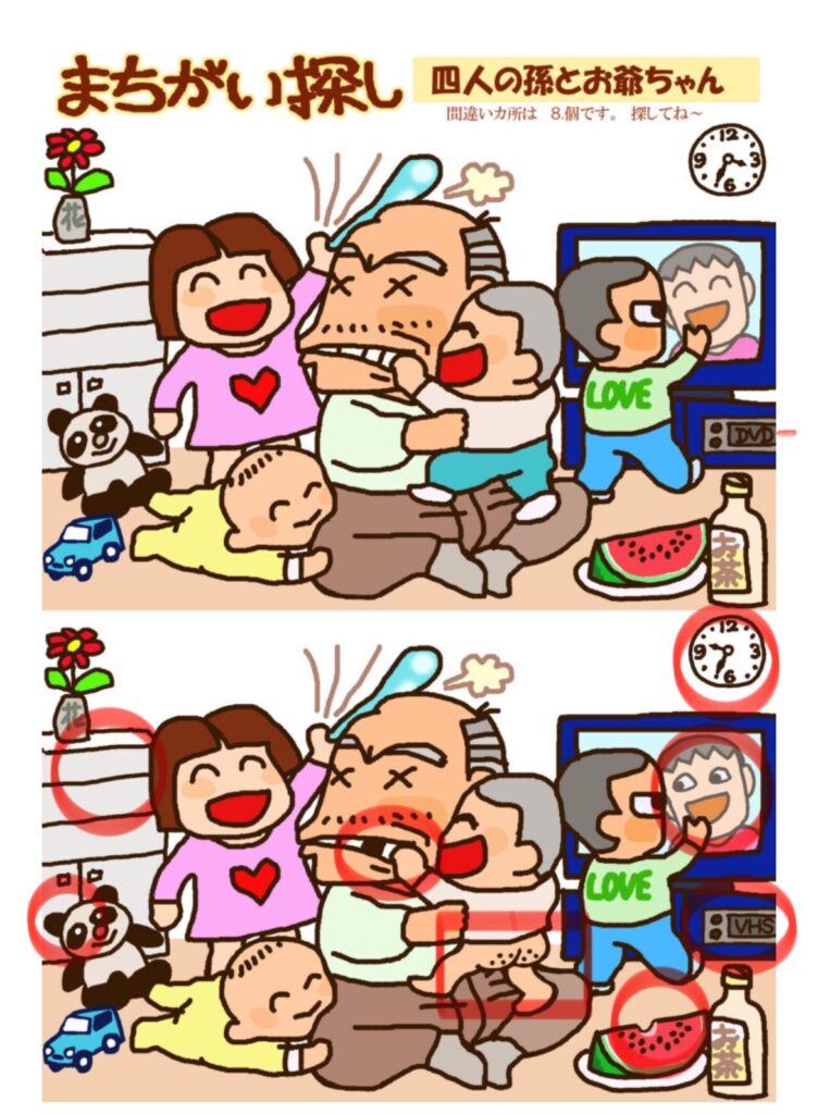 間違い探し 四人の孫とおじいちゃん 間違え探し ① 時計の時間② テレビの人の顔③ スイカがかじられている④ DVDとVHS⑤ お爺ちゃんの歯⑥ 抱っこされている子が下半身裸に⑦ タンスの引き出しの幅⑧ パンダの耳の大きさ(傾き) 間違い探し 見ざる言わざる聞かざる 間違い探し 忍者 ただいま参上 関連記事 otonanavi 間違い探し otonanavi 7つの間違い探し 留守番 otonanavi 脳トレ 間違え探し otonanavi 間違い探し 金太郎人形大量入荷 激むずかしい💦 otonanavi 一つだけ違う文字はどれ? otonanavi 間違い探し 美術の秋