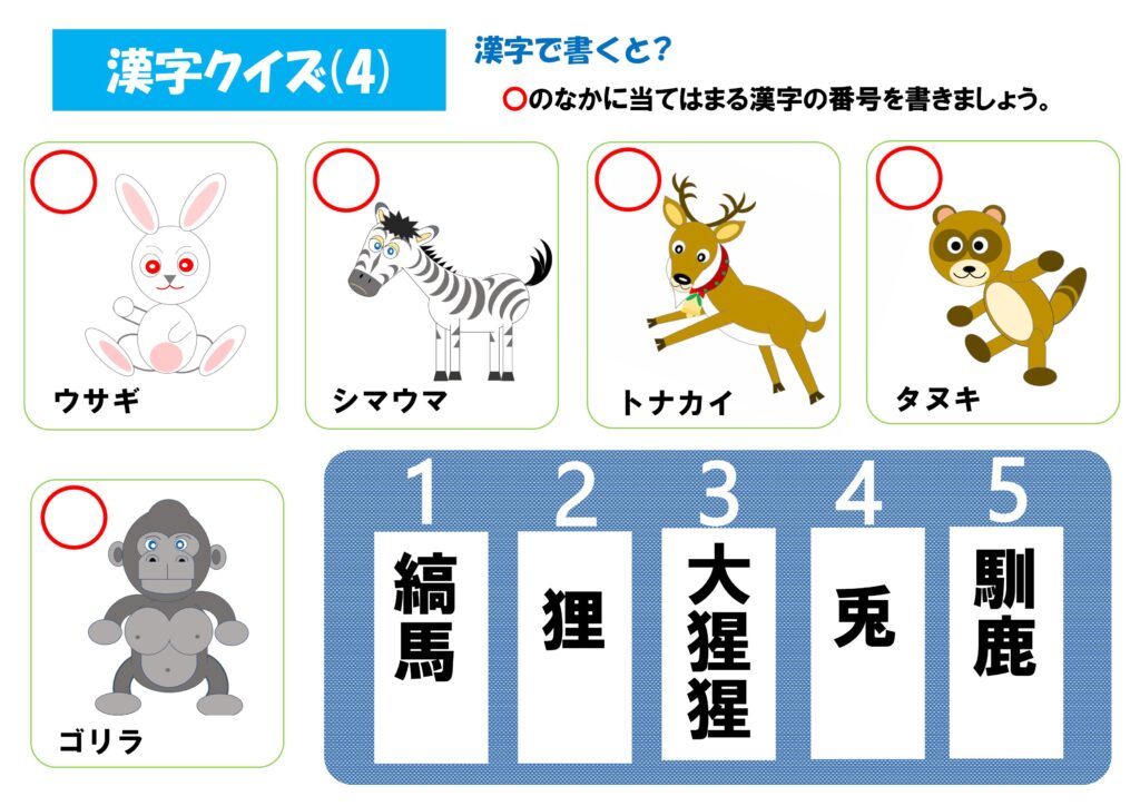漢字クイズ 〇に当てはま動物の漢字の番号を入れてください