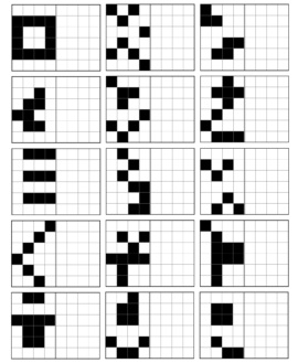 線対称塗りつぶしブロックは、与えられた図形の片側を見本にして、線対称になるように反対側を塗りつぶすパズル形式の脳トレです。