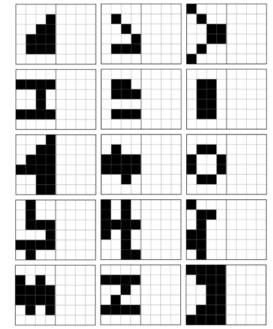 線対称塗りつぶしブロックは、与えられた図形の片側を見本にして、線対称になるように反対側を塗りつぶすパズル形式の脳トレです。