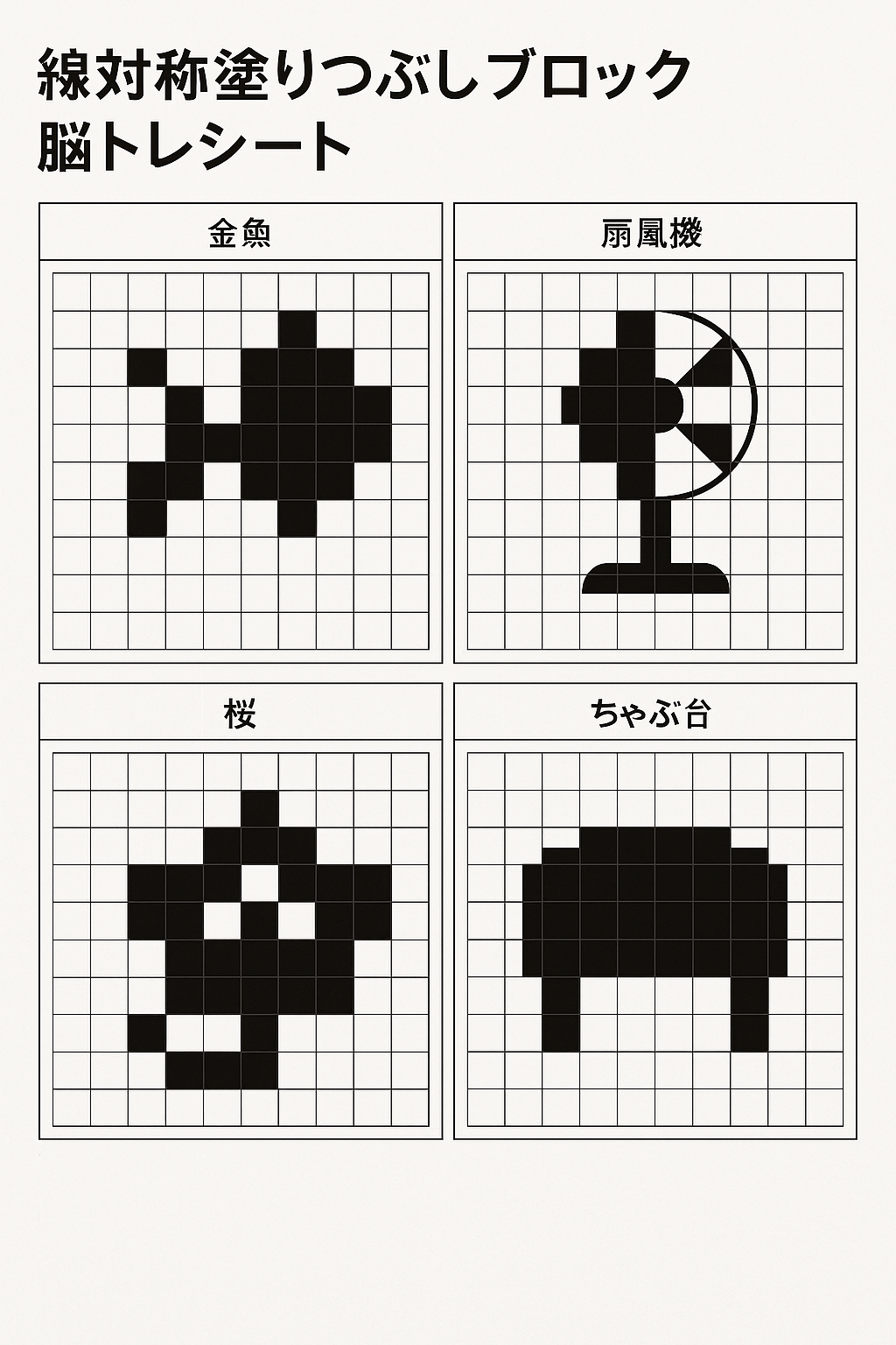 線対称塗りつぶしブロック +回想法 施設・自治体用, 脳トレシート ※印刷が可能です 東京五輪音頭を歌おう 般若心経とは? 関連記事 otonanavi ぬりえ otonanavi 高齢者が認知系レクを行うことで得られる主な効果 otonanavi 間違い探し 忍者と浪人の戦い otonanavi 夏祭りに嬉しいお菓子 ここから買えます otonanavi 【タカラトミー 毎日おしゃべり 天才インコちゃん】を介護施設で飼ってみませんか? otonanavi ひとつだけ違う字はどれ?