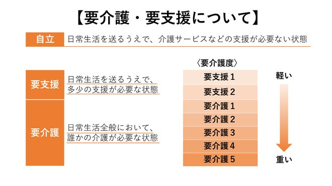 - 「要介護1〜5」は介護保険サービスの対象(訪問介護・施設入所など)