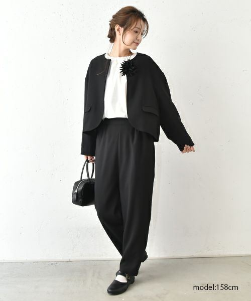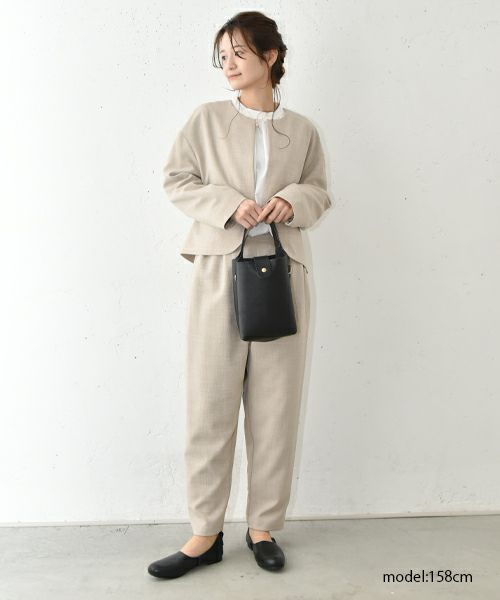パンツは裾に向かって細くなるテーパードシルエットで、脚長効果・美脚効果が期待できる一枚です。
