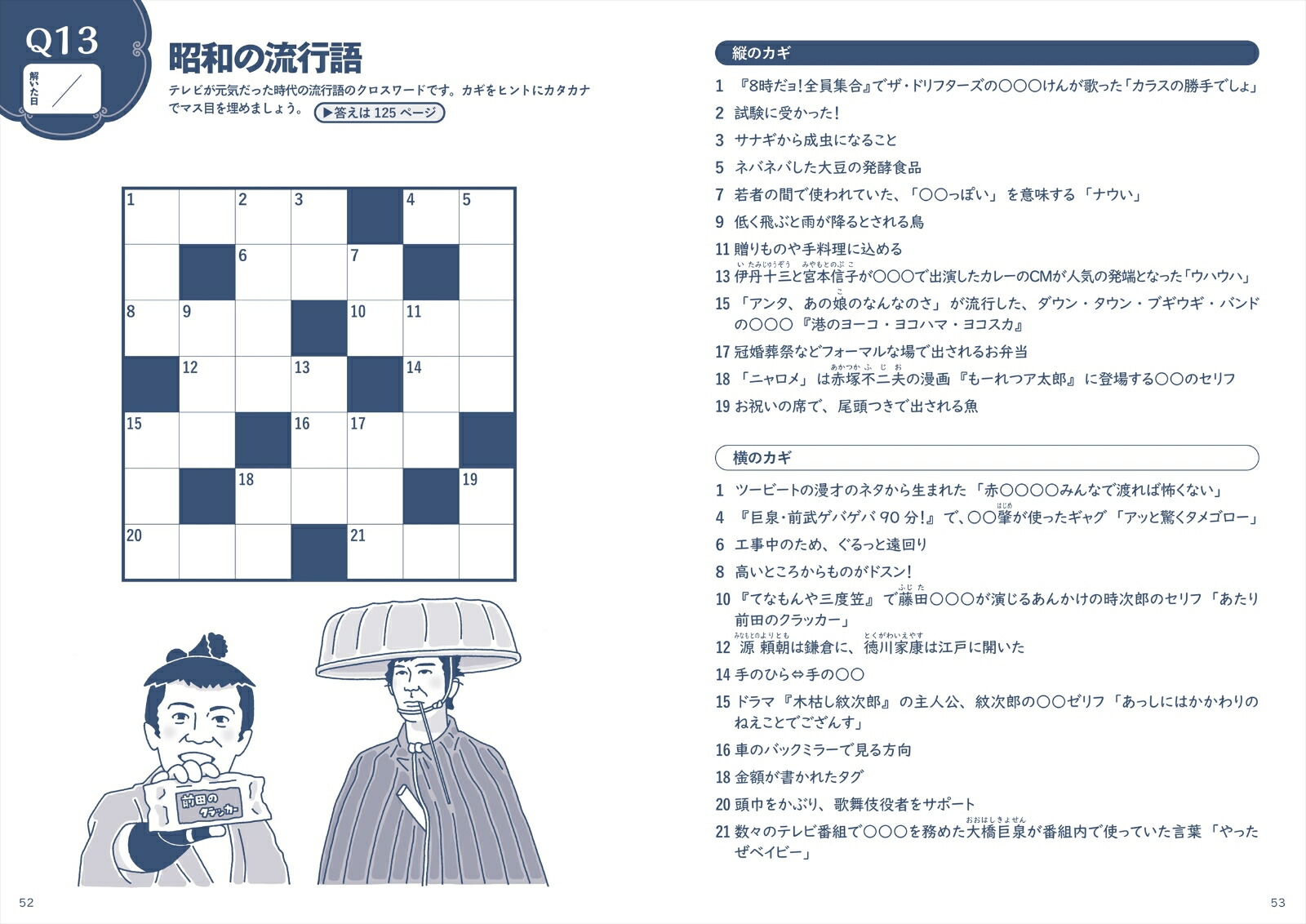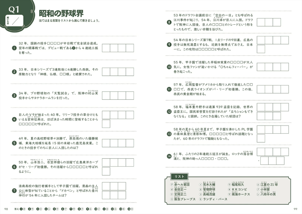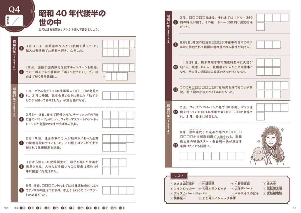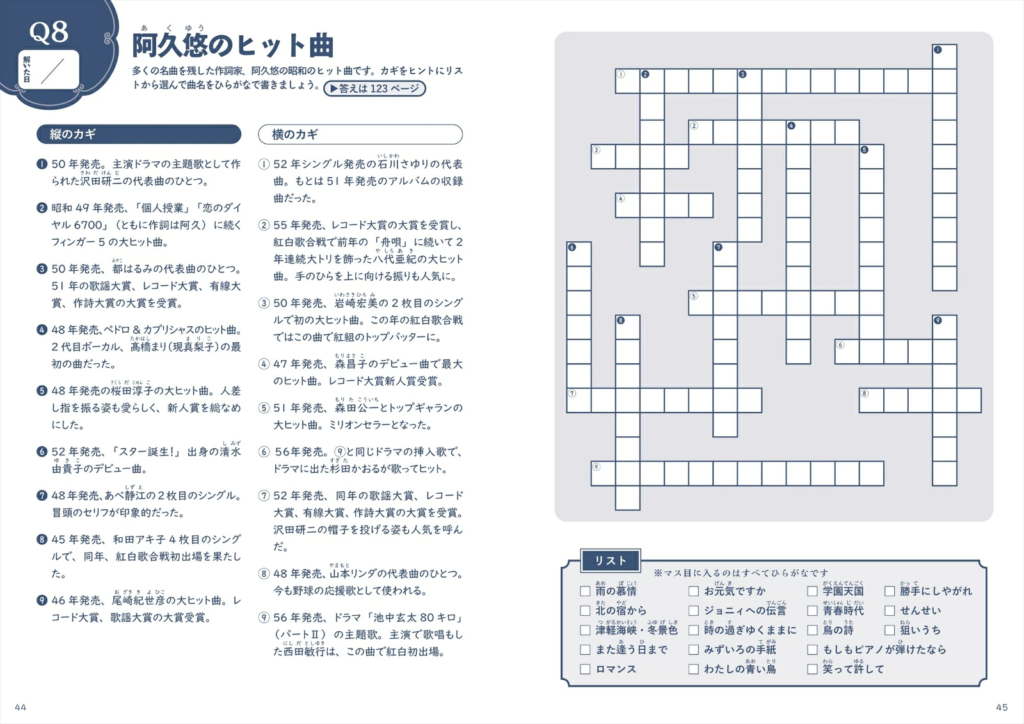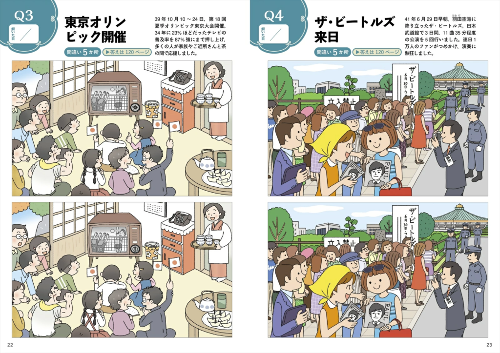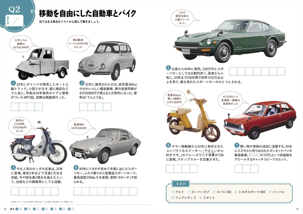 カラーページでは、昭和生まれのヒット商品をあてるクイズや昭和のニュースを題材にした間違い探しなど、写真やイラストを見て答える問題を収録。ほかにも、映画のタイトルと俳優を結ぶ線つなぎ問題、思い出の青春ソングをあてるシークワーズ問題、年代順に昭和の出来事を並べる問題など、バラエティに富んでいます。