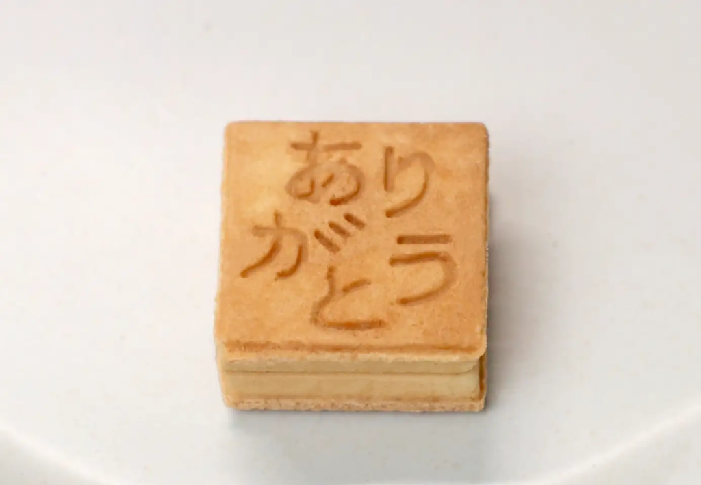 北海道産バター風味のクッキーで、高級バニラビーンズを使用したペーストをサンド。サクッとした食感のあと、とろっとした濃厚な味わいが口の中に広がります。クッキーの表面には、日本語で「ありがとう」という文字が刻まれています。